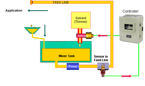 美國cambridge在線粘度計VISCOpro2000, VISCOpro1600等型號,具備強大的在線粘度檢測和粘度控制功能。下圖詳細(xì)解釋了應(yīng)用cambridge粘度計,通過單閉環(huán)粘度自動控制方式設(shè)計,實現(xiàn)粘度的自動控制,保證了粘度參數(shù)的精度和穩(wěn)定性。