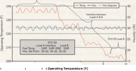 理解為什么混合物粘度有所不同負(fù)荷負(fù)荷只有一塊拼圖。結(jié)果如何理解不同的粘度是另一回事。不同等級(jí)的船用重油當(dāng)形式層儲(chǔ)存在相同的儲(chǔ)油罐。作為一個(gè)結(jié)果,以維持粘度設(shè)置點(diǎn)、燃油的燃燒控制系統(tǒng)必須應(yīng)對(duì)急劇變化時(shí)對(duì)燃油粘度變化之間的接口的掩體滿(mǎn)足燃油駁運(yùn)泵抽吸。(見(jiàn)圖查看插入的一個(gè)例子IF0120不同負(fù)荷)。圖說(shuō)明了一個(gè)相當(dāng)大的變化IF0120粘度的層之間所負(fù)荷圖作為°和°B。這需要改變粘度降低燃料溫度從240°F到200°F為了保持粘度設(shè)置點(diǎn)上30 cst。認(rèn)為會(huì)發(fā)生什么事假如操作者僅靠一個(gè)理論溫度設(shè)置點(diǎn)來(lái)自典型的燃料燃燒曲線(xiàn)。小費(fèi)會(huì)犯規(guī)燃燒器更加頻繁的排放會(huì)受到不良影響。